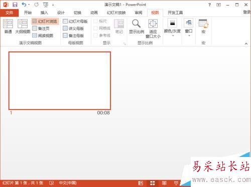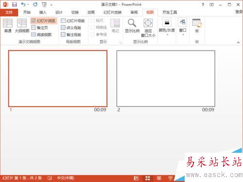 5、打開“視圖”菜單選項卡,點擊“演示文稿視圖”功能區的“幻燈片瀏覽”,這樣可以清除的看到每一張幻燈片播放需要的時間。如圖所示;