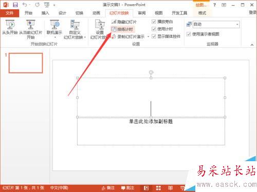 2、在PowerPoint2013程序窗口,打開“幻燈片放映”菜單選項卡,并點擊“設置”功能區的“排練計時”選項按鈕。如圖所示;