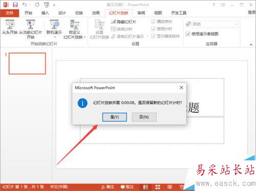 4、等待幻燈片放音,時間可以具體進行查看。待放映結束后,選擇“是”記錄下放映幻燈片的時間。如圖所示;