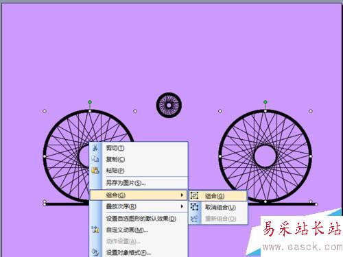 9、選擇繪圖工具里直線工具,繪制兩條條直線,調整兩個車輪所在的位置,選擇兩個車輪和直線,右鍵單擊從下拉菜單中選擇組合命令,將他們組合在一起形成一個圖形。