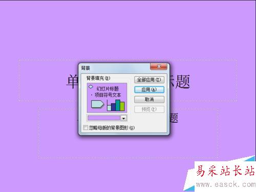1、首先啟動ppt,在空白區域右鍵單擊從下拉菜單中選擇背景選項,在彈出的對話框中設置紫色,接著點擊確定按鈕。