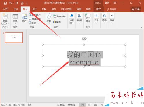 3、返回到PowerPoint中,在編輯區(qū)域我們發(fā)現(xiàn)PPT中多了一個(gè)文本框,這個(gè)是用來(lái)存放藝術(shù)字。選中之前的標(biāo)題文本框,將其刪除。如圖所示;