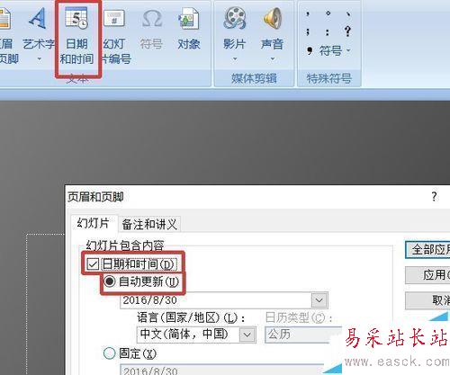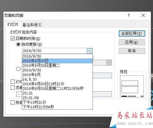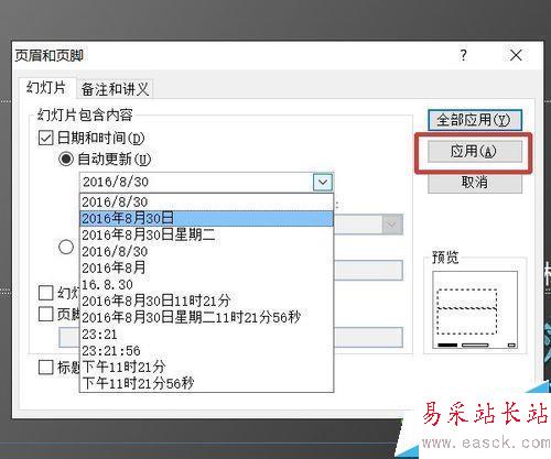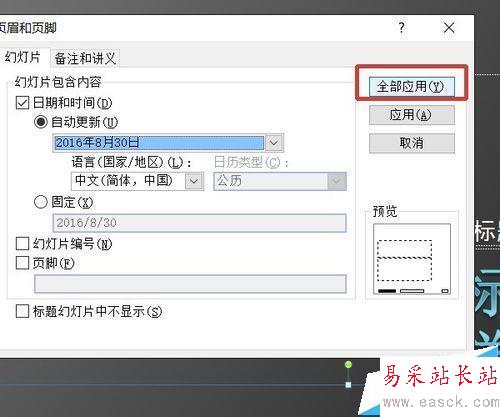 3、右側(cè)的應(yīng)用按鈕分“應(yīng)用”和“全部應(yīng)用”兩個(gè)按鈕,選擇“應(yīng)用”是對(duì)當(dāng)前的幻燈片使用輸入方式,其他幻燈片不變。在母版中則是使用此樣式的所有幻燈片的日期以更改后的為準(zhǔn)。