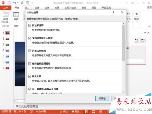 6、點擊“是”按鈕后,這個時候會打開“文檔檢查器”對話窗口。如圖所示;