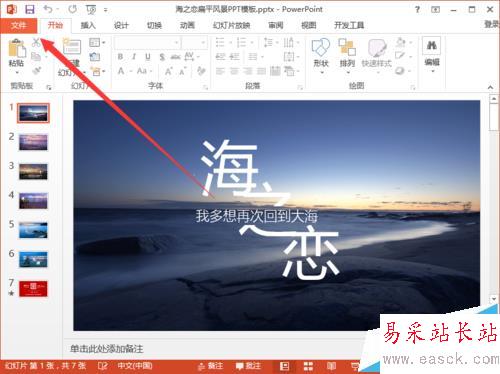 2、在PowerPoint2013程序窗口,點擊左上角的“文件”命令選項。如圖所示;