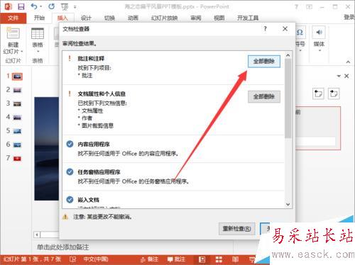 8、檢查之后,在批注和注釋后出現的“全部刪除”按鈕點擊它。如圖所示;