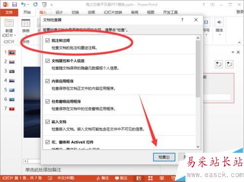 7、在文檔檢查器對話窗口中,一定要勾選“批注和注釋”選項,再點擊“檢查”按鈕。如圖所示;