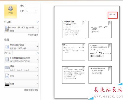 最近在打印幾個PPT文件,當我打印PPT講義時,發現自動會出現當前的打印日期,如下圖所示。剛開始覺得關系不大也就沒去理它,打的多了,感覺還是有點討厭的,因為有時我們不希望別人知道打印的時間。在網上先搜索了一下方法,還是沒解決,后來自己摸索了一下,總算找到了方法。