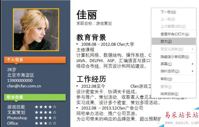 在播放PPT過程中,當需要放大某頁幻燈片時,可點擊鼠標右鍵,選擇“放大”。