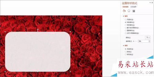3、接著我們在選中形狀后,右鍵選擇設(shè)置形狀格式或是雙擊形狀都可以,這樣我們就可以修改插入的形狀的顏色、形狀、去除邊框等操作,并且做好相關(guān)的調(diào)整,可借鑒下圖;