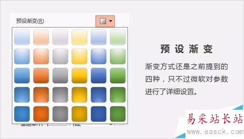 當然,還有一種比較簡單的方式——預設漸變,對于初接觸漸變的人來說比較容易使用些,技術含量不高,大家可以操作試試,高逼格的漸變都是大家一一測試出來的;