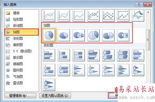 2、在彈出的“插入圖表”窗口左側的列表框中選擇圖表類型,然后在右側禮包中選擇子類型,點擊“確認”按鈕。