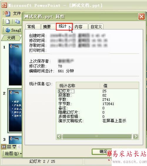 其實只要我們在PowerPoint中點擊菜單中的“文件→屬性”,打開“屬性”對話框,單擊“統計” 選項,就會看到當前演示文稿文檔的字數、段落等信息。