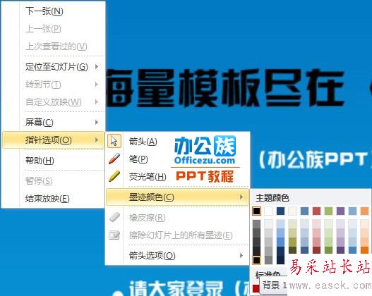 2、如果你對圖筆的顏色不感興趣,還可在右擊幻燈片時彈出的快捷菜單中選擇“指針選項”命令,再選擇“墨跡顏色”,選擇你喜歡的顏色。