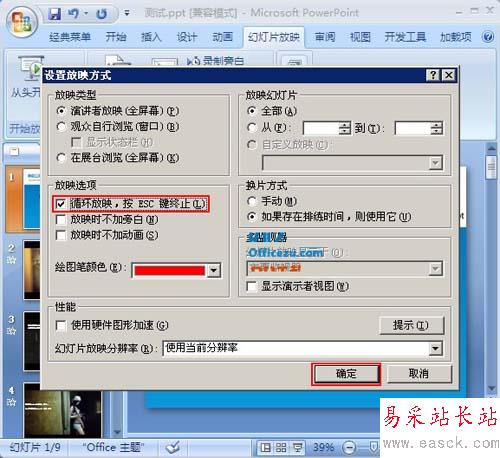 3、再在“放映選項(xiàng)”內(nèi)勾選“循環(huán)放映”,按ESC鍵終止”最后按“確定”。
