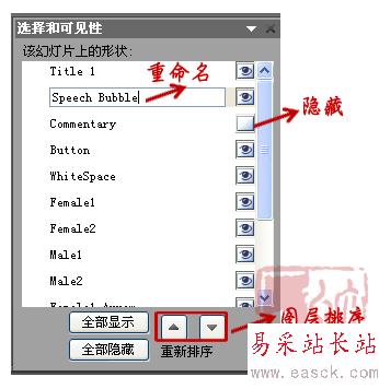 這時候“圖層管理”就大顯神威了。PPT2003里對動畫和圖層的管理是件煩瑣的事情,有些浪費時間。不過PPT2007和ppt2010就不一樣了,現在你能夠更有效方便的進行管理,比如將圖層打開或者關閉,改變排序等。你還可以將它們重命名,以便區分不同的操作對象