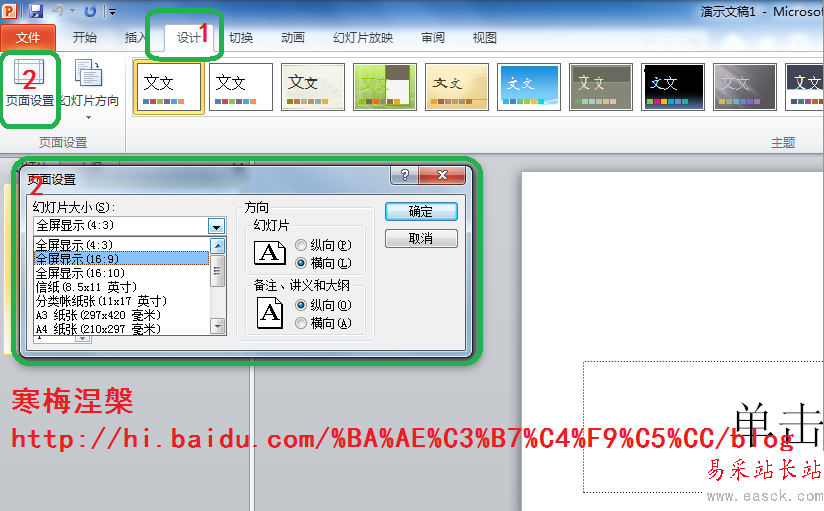 單擊菜單欄的“文件”中“頁面設置”,同樣此時會彈出“頁面設置”窗口,我們在“幻燈片大小”的下拉菜單中選擇最下面的“自定義”,然后在“寬度”和 “高度”中設置厘米數,如你的電腦分辨率是1440*900,75DPI的情況下,那么厘米數就應該是48.77*30.48。