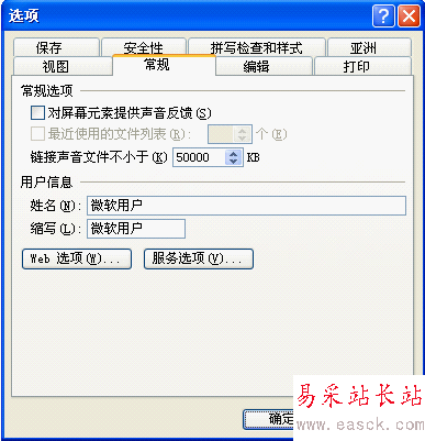 依次左鍵單擊“工具—選項”選項,在“選框”對話框中切換到“常規”窗口,將“鏈接聲音文件不小于”數值更改為“50000”KB,點擊“確定”按鈕,這樣就可以嵌入50MB以下的音樂文件了。
