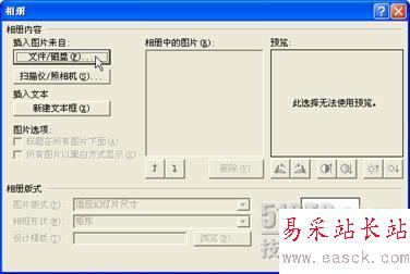 首先啟動PowerPoint,執行“插入”菜單下的“圖片”→“新建相冊”命令,打開“相冊”對話框。我們首先要選擇相片的來源,由于我們事先已經將相片存入電腦中,所以在此單擊“文件/磁盤”按鈕。
