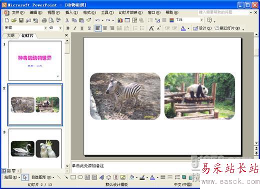 使用PowerPoint制作電子相冊的好處是,我們不必像以前一樣,很麻煩地設置每張相片的大小、樣式和說明文字,因為相冊中已經了有現成的版式設置,我們只需插入圖片就行!