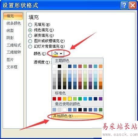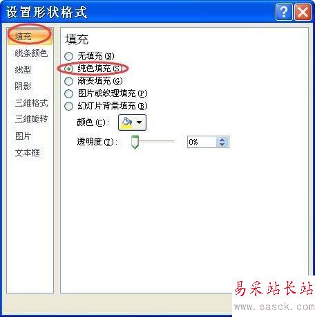 3、在設置形狀格式的對話框中選擇“填充-純色填充”如圖。