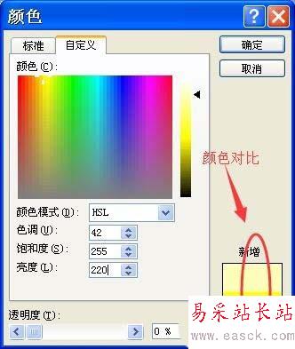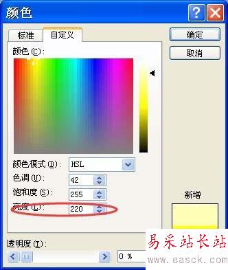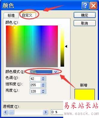 5、在顏色對話框中選擇“自定義”,將“顏色模式”設置為“HSL”。