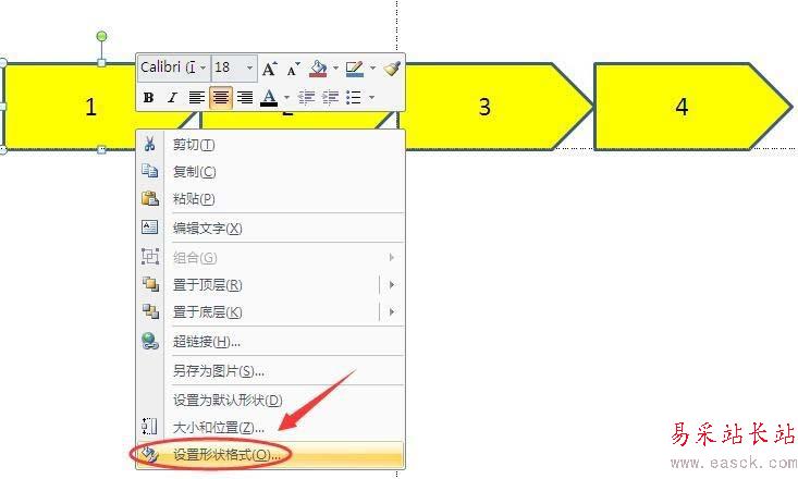 2、選中色塊1,然后右擊鼠標,點擊列表最下方“設置形狀格式”一欄。