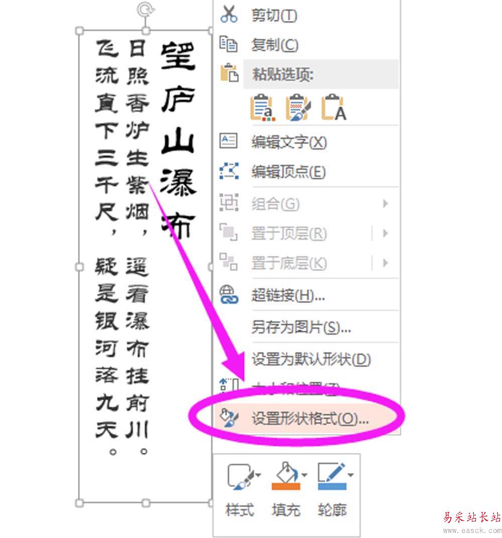 3、待文字調(diào)整合適之后,選擇文字文本框,點擊鼠標右鍵選擇“設(shè)置形狀格式”,即可打開右側(cè)設(shè)置操作,在右側(cè)設(shè)置里面找到“文本選項”,在該選項下“文本填充”里面找到“圖片或文理填充”——“文件”找到剛才的風景圖即可,如圖