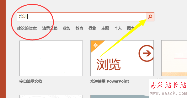 3、在這個提示輸入框下我們可以輸入培訓兩個字點擊后面的搜索來搜索培訓的模板。