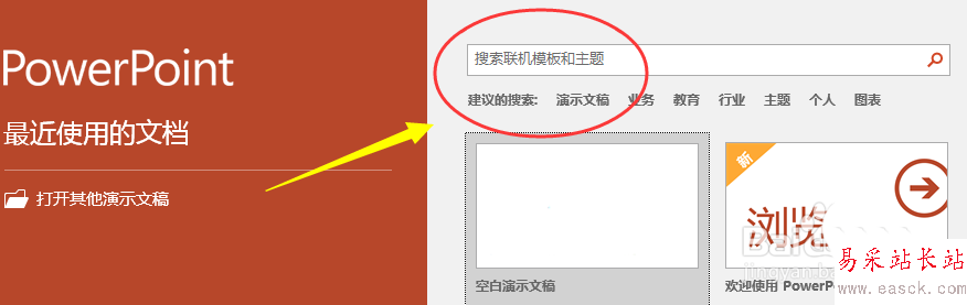 2、打開我們的PPT之后默認我們會來到當前的一個首頁。在首頁下面我們可以看到有一個聯機搜索模板的提示。