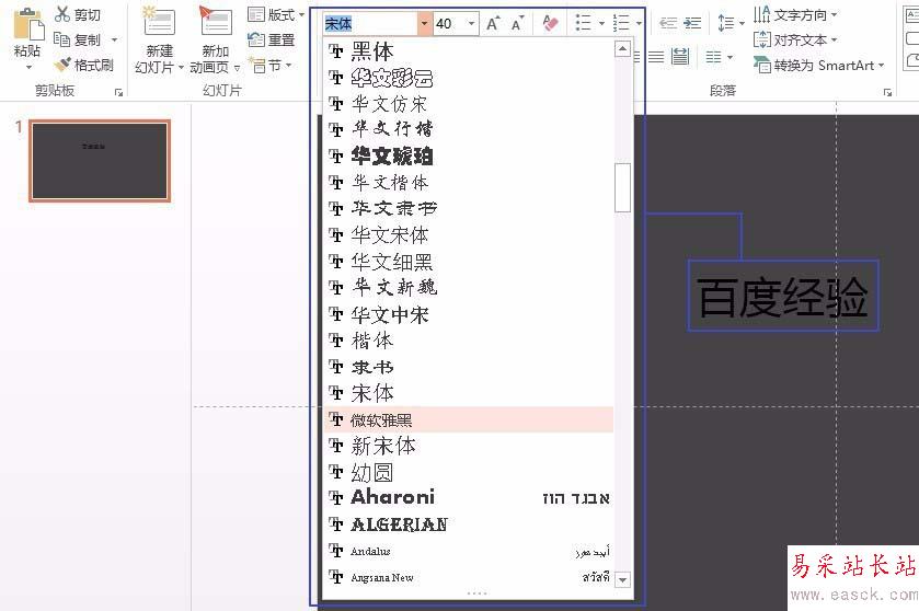 2、選中文字后,開始菜單-讓其居中對齊,并給字體設置一個合適的襯線字體。(下面將給字體設置為白色)