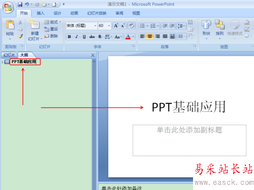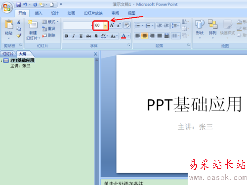 如果覺得字體不夠大,可以調(diào)整字體大小。比如,要調(diào)整“PPT基礎(chǔ)應(yīng)用”字體大小。用鼠標(biāo)框選“PPT基礎(chǔ)應(yīng)用”,框選后可看到該字體背景變暗了。調(diào)整字號(hào),比如調(diào)整為“60”。
