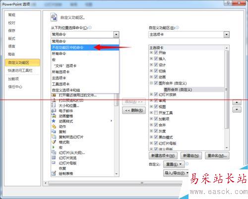 3、為新建的選項卡重命名,這里為了方便記住功能的作用,命名為了“圖形合并”。然后再在“從下列位置選擇命令”中選擇“不再功能區(qū)中的命令”。