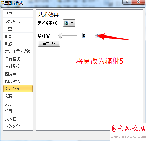 “設(shè)置圖片格式中”將藝術(shù)效果的輻射改為“5”。