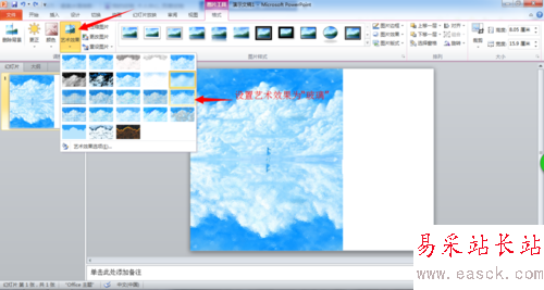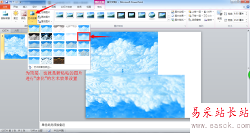 為上一步新粘貼的圖片,進(jìn)行編輯,設(shè)置圖片的藝術(shù)效果為虛化。然后右擊圖片,在