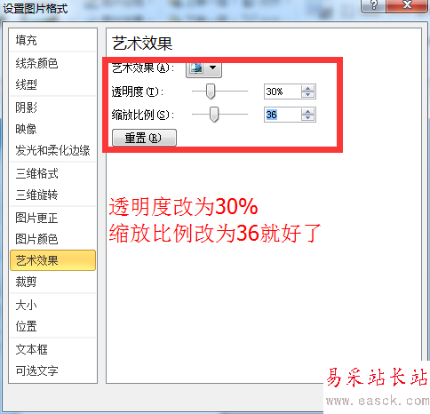為裁剪過的圖片設(shè)置水波的效果。首先為它設(shè)置藝術(shù)效果為“玻璃”。然后右擊圖片,在“設(shè)置圖片格式中”將藝術(shù)效果的透明度改為“30%”,縮放比例改為“36”就好了。