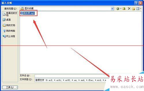 4、然后插入音頻文件,點擊“插入”-- “音頻”--“來自文件”,然后找到聲音文件,點擊“插入”,如下圖所示。