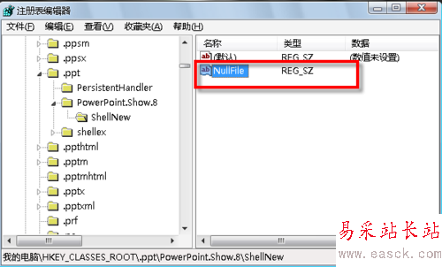 4、在ShellNew的右側窗格新建一個名為“NullFile”的“字符串值”