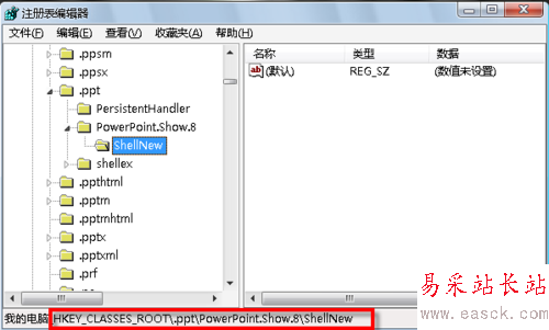 3、在注冊表編輯器中定位到“HKEY_CLASSES_ROOT/.ppt/PowerPoint.Show.8/ShellNew”。