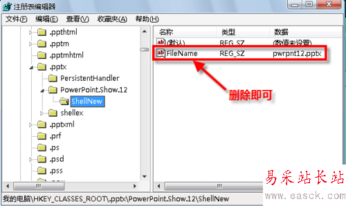 6、如果只想保留新建97-2003 PowerPoint文檔,那么可以在注冊表中定位到“HKEY_CLASSES_ROOT/.pptx/PowerPoint.Show.12/ShellNew”,將右側的“FileName”刪除即可。
