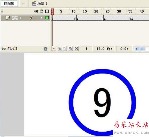 首先,進入FLASH利用畫圓工具繪制一個鐘表的外框,然后在內側寫入數字,根據倒計時的要求調整時間的長短,這里設置為10秒。