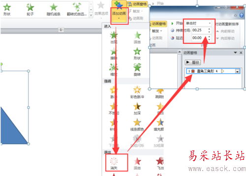 8、從最上層開始為三角形添加消失動畫,動畫參數如圖所示,除了第一個動畫開始方式為單擊,其它的開始方式都設為“上個動畫之后”。