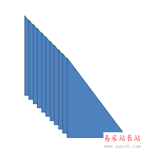 2、把畫出的三角形復制若干份,具體多少份要看具體情況,當然復制的份數越多,動畫越細膩。在這里我復制了11份,因為我化三角形寬度是6厘米,我想讓它寬度每次縮短0.5厘米,11次寬度正好縮短為0.
