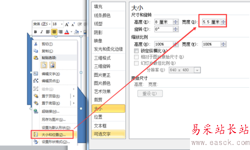 3、把復制出來的這12個三角形的寬度依次縮小0.5。方法是右鍵單擊某一個三角形,選擇“大小和位置”,然后在“設置形狀格式”對話框中把更改寬度的數值。如圖所示: