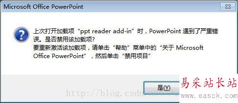 重啟電腦再運行PowerPoint 2003,又提示:上次打開加載項“ppt reader add-in”時,PowerPoint遇到了嚴重錯誤。是否禁用該加載項?要重新激活該加載項,請單擊“幫助” 菜單中的“關(guān)于 Microsoft Office PowerPoint”,然后單擊“禁用項目”。