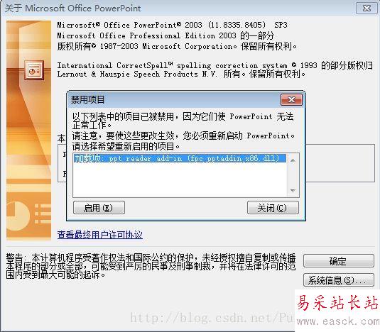 打開PowerPoint 2003,單擊“幫助” 菜單中的“關(guān)于 Microsoft Office PowerPoint”,然后單擊“禁用項目”,終于看到了引起PowerPoint 2003打開時出錯:PowerPoint 發(fā)現(xiàn)無法更正的錯誤。最好保存演示文稿并退出 的原兇——加載項“ppt reader add-in”的真面目: