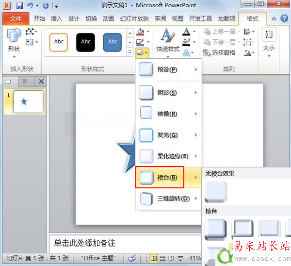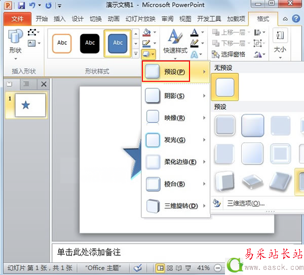 ②畫好之后,選中,在格式選項卡中單擊形狀效果,在預設中選擇第三排第四個樣式。