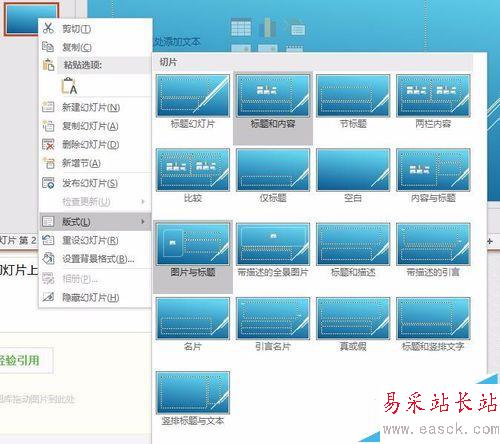 8、可以在幻燈片上右鍵,版式,選擇適合的版式,進行使用。