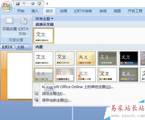 1、設計面板中我們選擇好喜歡的幻燈片背景,其實這是整個幻燈片主題的設計,也包含有文本、線條等色彩的設置,整體布局等。這里我選擇了市鎮。