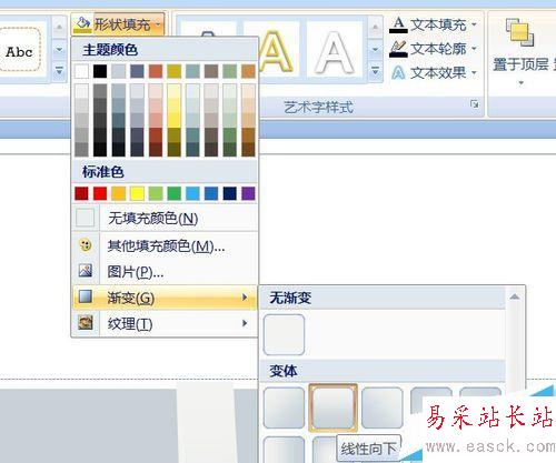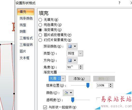 8、添加漸變填充。繪圖工具——格式——形狀填充——漸變——線性向下。填充——漸變光圈,光圈2如圖設置。